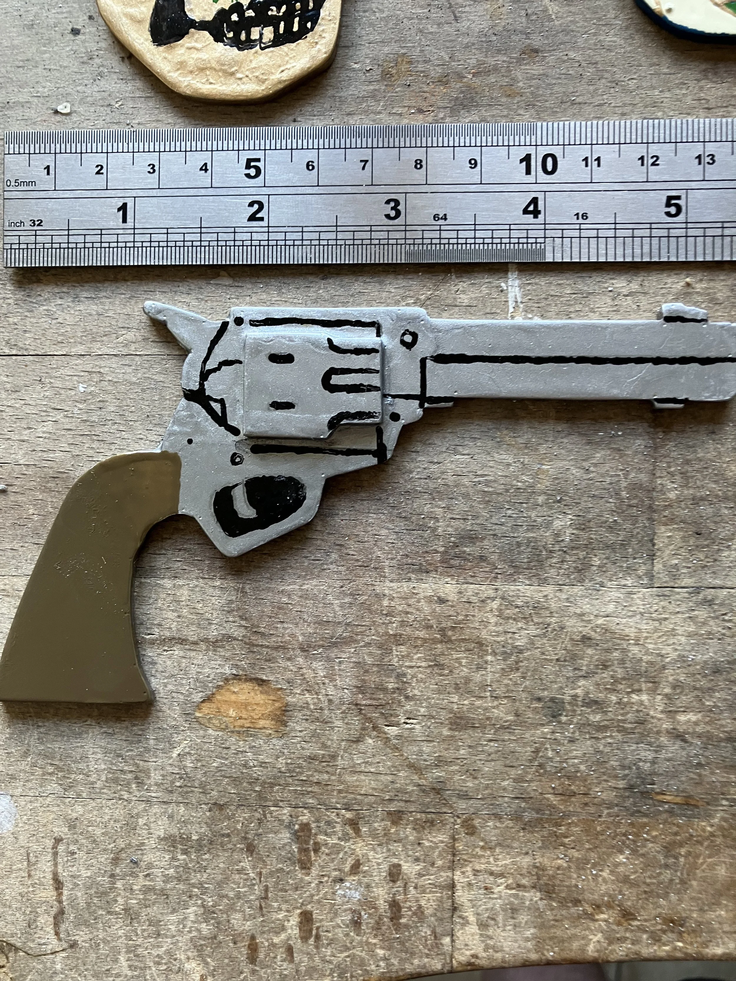 Saddle up and stand out with this one-of-a-kind handmade belt buckle featuring a classic Wild West Colt 45 revolver. Crafted with meticulous care, this statement piece is a bold addition to any wardrobe. Its metallic grey barrel and olive-brown handle accented with hand painted black outlines, bring the rugged sprit of the frontier to life. Perfect for the modern cowboy or cowgirl who values authenticity and artistry.